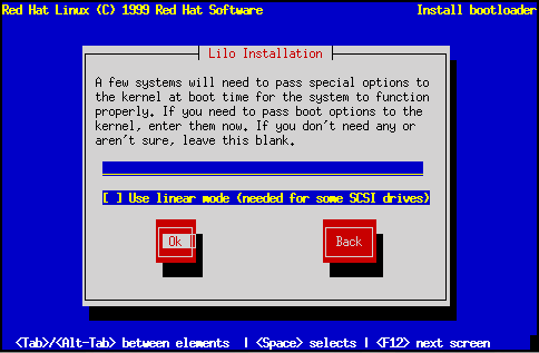 A continuación, el programa de instalación le preguntará si desea añadir opciones por defecto al comando de arranque de LILO (vea la figura fig:inst-liloopt). Algunas de las opciones introducidas se pasarán al núcleo de linux cada vez que arranque. Mientras revise los parámetros de la BIOS de su computador, si encuentra que su computador accede al disco duro en modo LBA, elija la opción Usar modo lineal.