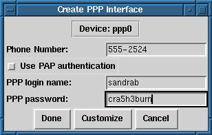 - Agregar una interfaz PPP puede ser tan simple como proporcionar un número de teléfono nombre (login) y clave en la ventana de diálogo Create PPP Interface mostrada en la figura fig:netcfg-create-ppp. Si necesitas utilizar autenticación PAP para tu conexión PPP, elige Use PAP authentication. En muchos casos necesitarás algún grado de personalización para establecer una conexión PPP. Pulsar el botón Customize te permitirá hacer cambios a las opciones de hardware, comunicaciones y red de la interfaz PPP.