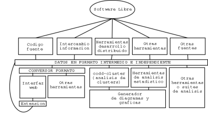 Antes de mostrar pormenorizadamente las herramientas existentes para las cada una de las fases, se debe mencionar que aún cuando la arquitectura completa del sistema puede parecer compleja, esto no es así. Existe una gran modularidad e independencia y el "pegamento" que da sentido a todo esto es la capa donde viene especificado que los datos se almacenarán en un formato intermedio e independiente. Esto quiere decir que una aplicación de extracción de parámetros de código fuente es totalmente independiente de otra que toma datos debidos al desarrollo distribuido. Es más incluso lo es de otra que también se encarga de estudiar el código fuente. Lo que debe preocupar a las aplicaciones es ofrecer sus resultados en el formato intermedio, haciendo uso de filtros si es conveniente realizar conversiones a otros formatos.