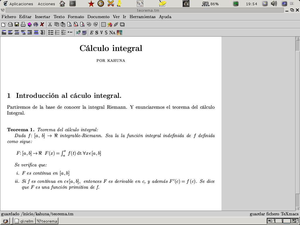 5. Crearemos el "Teorema". Hacemos clic en el icono "Teorema", y escribimos el teorema de fundamental del cálculo integral (por ejemplo :) Hay que tener en cuenta cuando debemos entrar y salir del modo "matemático" de TeXmacs. Es muy sencillo.