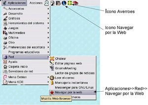 1. Aplicaciones >> Red >> Navegar por la Web 2. Icono Navegar por la web 3. Icono Averroes (se abre Mozilla y se visualiza la página web de Averroes (www.juntadeandalucia.es/averroes) |