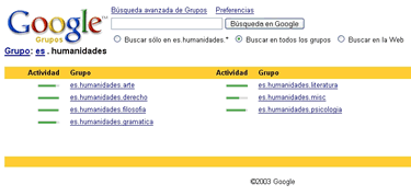 1. Al seleccionar la pestaña grupos de Google accedemos al primer nivel de clasificación. En este nivel aparecen, al principio, las dos ramas que contienen los grupos en español (es. y esp.). Hacemos click sobre es., por ejemplo.