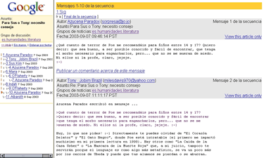 7. Al expandir una rama podemos ver la típica cadena de mensajes de los foros. Cada mensaje cuelga de aquel al que está respondiendo. Aquí podemos ver cómo el primer mensaje con el asunto Vuelta al trabajo lo envió Azucena, Toni le contestó, Azucena contestó a Toni, Manuel contestó a Azuzena y María contestó al primer mensaje de Azucena. Todos estos mensajes son públicos y pueden ser leídos por cualquier usuario. |