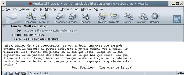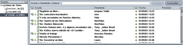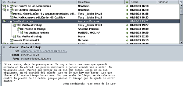 6. Al hacer click sobre uno de los foros, Mozilla Mail descargará del servidor los mensajes de dicho foro, que aparecerán en la parte superior derecha de la parte central del programa. Vemos como algunos mensajes llevan el triángulo a su izquierda que indica que esa rama puede expandirse, en este caso significa que ese mensaje tiene respuestas. Expandamos una de esas ramas. |