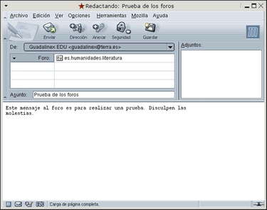 El botón Redactar es el que usaremos para enviar un mensaje al foro no como respuesta a ningún otro, sino directamente al foro. En este caso aparecerá cumplimentada la dirección del correo pero no el asunto (el programa no puede saber de qué va nuestro mensaje). Cumplimentamos los campos y lo enviamos.