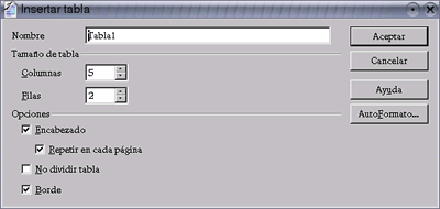 1. Para crear una tabla, en el menú principal iremos a Insertar->Tabla y se nos abrirá la ventana que aparece bajo este texto. Podemos especificar allí un nombre de la tabla o el programa asignará uno por defecto, el número de columnas, el de filas y por el momento no seleccionaremos un campo: Encabezado. Esto último tengámoslo en cuenta porque por defecto el campo está marcado.