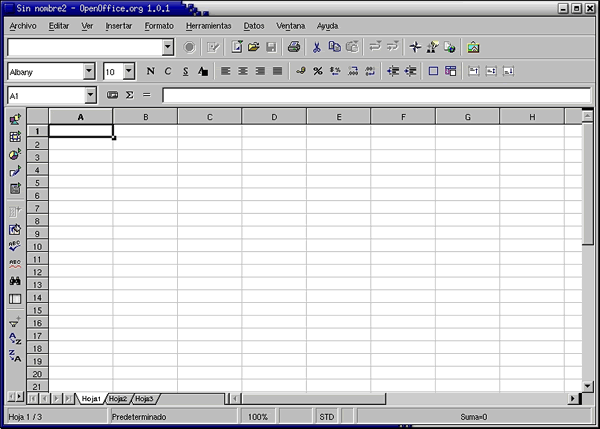 Entrar en Calc es igual de fácil que entrar en Writer. En el escritorio de GuadaLinex hay que acceder a Aplicaciones->Oficina->Hoja de cálculo de OpenOffice.org, con lo que nos encontraremos con el panorama que muestra la siguiente imagen.