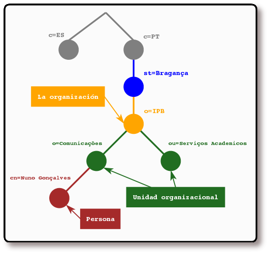 En LDAP, las entradas están organizadas en una estructura jerárquica en árbol. Tradicionalmente, esta estructura reflejaba los límites geográficos y organizacionales. Las entradas que representan países aparecen en la parte superior del árbol. Debajo de ellos, están las entradas que representan los estados y las organizaciones nacionales. Debajo de estás, pueden estar las entradas que representan las unidades organizacionales, empleados, impresoras, documentos o todo aquello que pueda imaginarse. La Figura 1-1 muestra un ejemplo de un árbol de directorio LDAP haciendo uso del nombramiento tradicional.