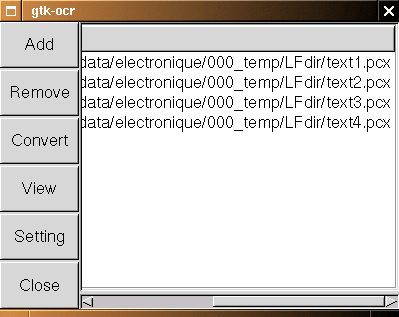 Nun kommt gtk-ocr ins Spiel, die Oberfläche zu gocr. gocr ist eine Software für optische Zeichenerkennung. Es ist recht einfach zu benutzen: Ich musste nur die Dateien auswählen und gtk-ocr verwaltet alles. Ich erhielt eine .txt-Datei für jede bearbeitete .pcx-Datei.