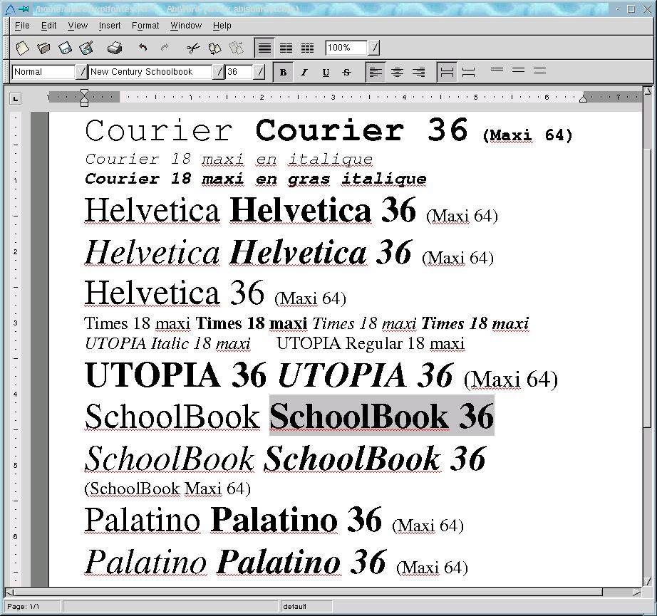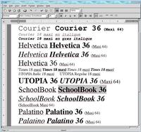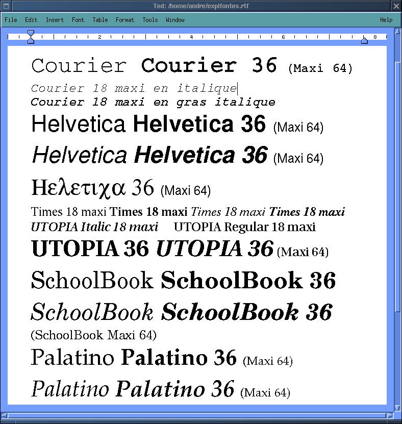 Nach der Installation hat Ted vier Schriften zur verfügung: Times, Helvetica, Courrier und Symbol. Es handelt sich um metrische Schriften von Adobe, die im AFM Format sind; im Prinzip kann Ted je Schrift dieses Typus benutzen und da die Verzeichnisse /usr/share/enscript oder /usr/share/ghostscript eines Linux-Verzeichnissbaums eine menge besitzen, ist der Wunsch sie zu benutzen gross, vor allen Dingen da die mitgelieferte Schrift Times in der Grösse auf 18 Punkte beschrenkt ist, genauso wie die Courier Kursiv und Fett Kursiv.