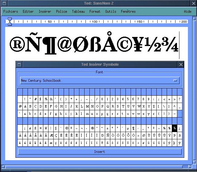 - Symbol (Symbole) oder besonderes Zeichen, den man dank der Zeichentabelle plaziert hat. Man braucht nur das Zeichen auszuwählen, dass man einfügen will und auf Insert zu klicken. Das Einfügen geschiet am aktuellen Cursorposition.