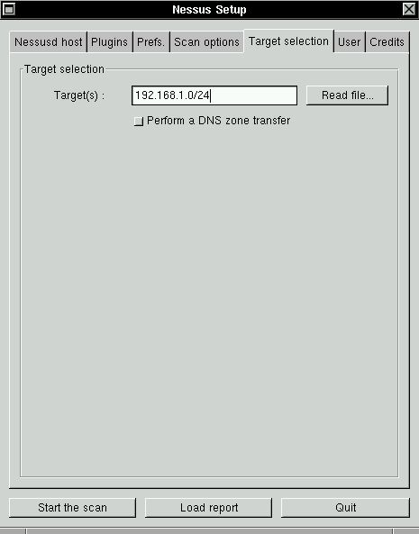 The fifth tab is where you tell nessus the target of your scan. In the target field you can write the name of a host, the name of different hosts separated by commas, one or more IP addresses, again separated by commas, or a network address with its netmask (for example 192.168.1.0/24). There's also a check box to perform a DNS zone transfer. That is, connecting to a DNS server, nessus will try to get the list of the hosts in this domain.