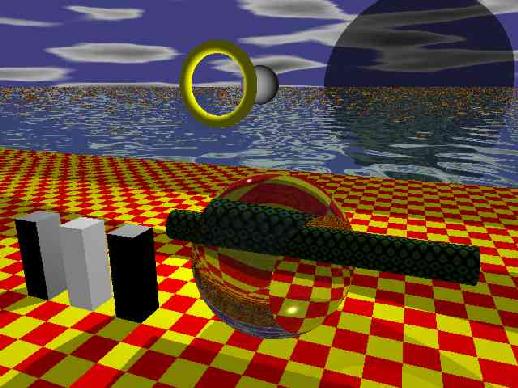 Si quelqu'un est intéressé par la configuration de Povray pour SVGA (je ne l'ai pas moi-même réalisé), la première chose que vous apprendrez est que la vitesse du rendu dépend de la région de l'image ; les régions complexes nécessitent plus de temps que les régions les plus simples. Les zones avec plusieurs objets prennent plus de temps à calculer que celles avec un seul ou aucun. Pour chaque impact de rayon sur un objet, le moteur de rendu calcule l'effet sur l'éclairage en regard de la position et de la couleur de la source de lumière, sa position relative par rapport à la surface des objets, ainsi que la texture de l'objet et autres caractéristiques physiques. Le résultat de ce calcul est spécifié dans trois valeurs RGB qui définissent la couleur et l'intensité du point dans l'image.