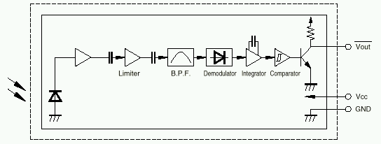The following comes from the sensor IS1U60 technical specifications (http://ns14.sharp.co.jp/ecg/unit/is1u60/is1u60-fea.html), and presents the internal structure. The two left arrows represent the infra-red light converted into an electric signal through the led. The signal is amplified, the direct component is eliminated, it's filtered to let frequencies close to 38 Khz go through, next it's corrected (demodulator+integrator), and last it's converted into a compatible TTL signal.