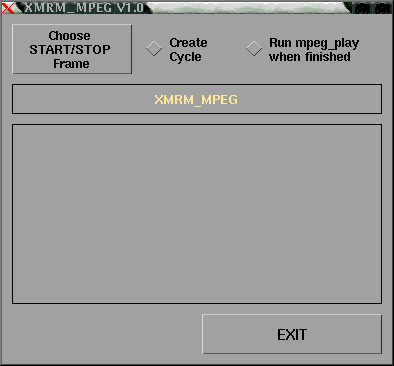 Você chama este diálogo clicando em "Execute xmrm_mpeg". Escolhe depois a primeira e a última imagem da animação utilizando o botão "choose start/stop frame", e clique GO para iniciar a operação final que faz a animação mpeg.
