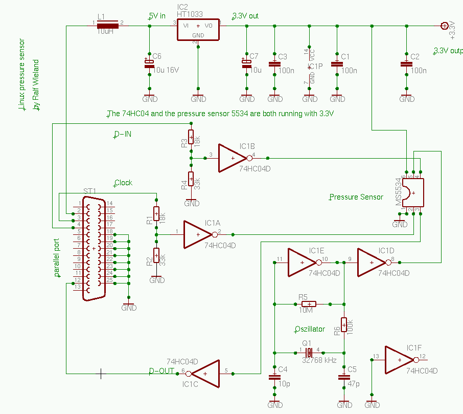 Hava basıncı birçok nedenden dolayı ilginçtir. Gemici ve dağcılar için o, havadaki olası bir değişikliğin belirtisidir. Fakat benim için evde hava basıncını izlemek de eğlencelidir. Oturma odalarında kurulmuş küçük hava istasyonlarından görüldüğü üzere birçok başka insan da aynı seyi yapıyor gibi. Bununla birlikte, bunlar çoğunlukla gerçek ölçüm aletlerinden çok oyuncaktırlar. Eğer, hava basıncı ile ilgili ciddi ölçümler yapmak istiyorsanız birkaç şeyi daha göz önünde bulundurmanız gerekir. Hava basıncı doğru olarak, yukarıdaki resimde gösterildiği gibi, bir barograf ile ölçülebilir. Bu aletler tamamen mekanik olup, çok pahalıdırlar. Fazla masraftan kaçınmak için bir elektronik yarı iletken algıyıcı kullanılabilir. Motorola değişik amaçlara yönelik birkaç tipte algılayıcılar üretmektedir. Yarı iletken algılayıcılar herzaman sıcaklık ve gerilime bağımlıdırlar. Bunu hesaba katmalısınız. Hava basıncı, evin içinde ve dışında aynı olduğundan, ölçümü göreceli olarak kolaydır. Algılayıcıyı dışarıda kullanım için inşa etmek ve yağmura karşı korumak zorunda değilsiniz. Algılayıcıyı doğrudan bilgisayarınızın yanında bulundurabilirsiniz. Sıcaklık evin içinde dışarıdaki kadar çok değişmediği için bu sıcaklığın telafisi için de iyidir. Yüksek doğrulukta sonuçlar elde etmek için elektronik bir sıcaklık düzenleyicisine gereksinim duyacaksınız. Önerilen devre takım olarak bir Avrupalı elektronik dağıtıcısından elde edilebilmektedir. ELV, bana devreyi yayımlama iznini verdi. Sıcaklığın telafisi bu gibi durumlarda bir yazılım tarafından yapılmaktadır. Algılayıcı sadece basıncı değil, aynı zamanda sıcaklığı da ölçer. Sıcaklığın telafisi icin algoritma Intersema'nın hava basınç algılayıcısı veri sayfasında belgelenmiştir. Gerilimin kararlılığı bir 3.3 V düzenleyiciyle yapılır.