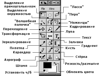 Эта панель инструментов стабильной версии Gimp 1.0.4. Но я Вам очень рекомендую установить последнюю версию, поскольку в ней много новых возможностей. Например, Gimp 1.1.9 не вызывает никаких проблем (на моём redHat 6.0), содержит 6 дополнительных инструментов, новые возможности для инструмента "перо", новую навигационную систему для масштабирования, ...