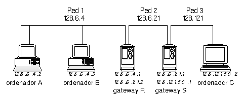 Este gráfico muestra tres ordenadores, 2 gateways y tres redes. Las redes pueden ser Ethernet, Token Ring o de cualquier otro tipo. La red 2 podría ser una línea punto a punto que conecta los gateways R y S.