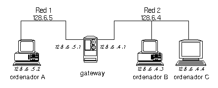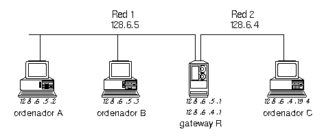 Los gateways tienen asignada una dirección IP por cada interface. Las tablas de enrutamiento de los ordenadores deberán configurarse para hacer los envíos a las direcciones adecuadas. Así, por ejemplo, el ordenador A tienen una entrada estableciendo que debe usarse el gateway 128.6.5.1 para alcanzar la red 128.6.4.