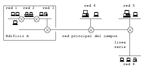 El término "red" generalmente se suele identificar a dispositivos del tipo Ethernet, en la cual varias máquinas están conectadas. Sin embargo, también se aplica a líneas punto a punto. En el gráfico anterior, las redes 1 y 3 podrían estar en ciudades distintas; la red 2 podría ser una línea serie, un enlace satélite, u otro tipo de conexión punto a punto. Una línea punto a punto es tratada como una red que consta sólo de dos ordenadores. Como cualquier otra red, una línea punto a punto tiene una dirección de red (en este caso, 128.6.21). Los sistemas conectados por la línea (gateways R and S) tienen direcciones en dicha red (en este caso, 128.6.21.1 y 128.6.21.2).
