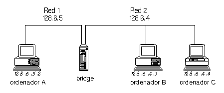 Hay que decir que un bridge no tiene una dirección IP. En lo que se refiere a los ordenadores A, B y C, hay una sola Ethernet a la que están conectados. Esto se traduce en que las tablas de enrutamiento deben configurarse de manera que los ordenadores de ambas redes se traten como si fuesen locales. Cuando el ordenador A abre una conexión con el ordenador B, primero se envía una petición ARP preguntando por la dirección Ethernet del ordenador B. El bridge debe dejar pasar esta petición de la red 1 a la red 2. (En general, los bridges deben atender todas las peticiones). Una vez que ambos ordenadores conocen las direcciones Ethernet del otro, las comunicaciones usarán las direcciones Ethernet en el destino. Llegados a este punto, el bridge puede empezar a ejecutar alguna selección, y dejará pasar aquellos datagramas cuya dirección Ethernet de destino se encuentren en una máquina de la otra red. De esta manera un datagrama desde A hasta B pasará de la red 2 a la red 1, pero un datagrama desde B hasta C se ignorará.