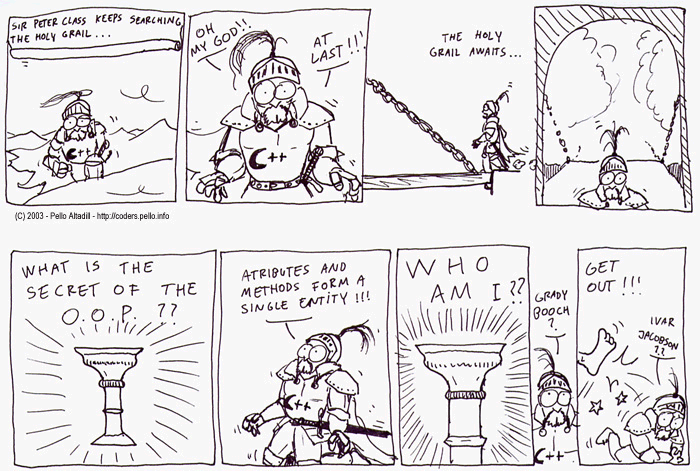 Programacion orientada a objetos Es probable que te toque hablar con amiguetes que programan en la lengua de Mordor (visualbasic) o gente que programa en c ofuscado, o lo que es peor, desconocidos que te dicen que "programan" en HTML; estos intercambios de experiencias, esas afirmaciones sobre rendimientos de ejecucion pueden hacer tambalearse los cimientos de tu fe en la POO. Gracias a estas anotaciones rescatamos del olvido las excelencias de la POO y nos armamos de argumentos ante los herejes que nos salgan al paso con listados de codigo en ristre.