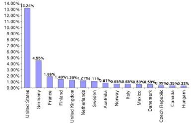 En la primera gráfica, se puede ver la contribución por nacionalidades. El factor desconocido (código que no puede ser asignado o que ha sido asignado a una organización plurinacional, como es el caso de la Free Software Foundation) es muy grande, llegando a ser ligeramente superior al 60%.
