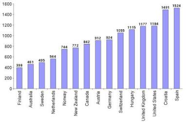 No sólo es interesante el número de desarrolladores que residen en cada país, sino que estaría bien ver la proporción de desarrolladores Debian que hay por habitante, algo así como una tasa de desarrolladores Debian per cápita. Para ello, se ha tomado el número de habitantes de cada país de los datos que ofrece la ONU y se ha dividido entre el número de desarrolladores Debian. Vemos que allí donde esta tasa es mayor (y, por tanto, el número de habitantes por cada desarrollador Debian es menor) es en la zona nor- y centroeuropea, así como en Australia y Nueva Zelanda. España, aunque no mal situada, ya se va quedando muy atrás, incluso por debajo de la media de la Unión Europea (1 desarrollador cada 1.226.000 ciudadanos). Para alcanzar el mismo número de desarrolladores per cápita que hay en Finlandia, en España deberíamos llegar al centenar.