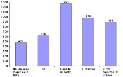 Una de las razones más frecuentes a la hora de explicar por qué los desarrolladores dedican tiempo a la creación de software libre es que sus condiciones laborales no son satisfactorias. Por eso incluimos dos preguntas para ver qué es lo que nos podían contar los propios desarrolladores al respecto. La primera es la relación con su superior y qué tal lleva éste que se participe en desarrollos de software libre. Como se puede ver, en un tercio de los casos, los jefes ven con buenos ojos que se colabore. Aproximadamente otro tercio lo sabe, pero no le importa, y el último tercio se lo reparten los que no lo saben o incluso los jefes que no lo saben, por que no tienen ni idea de lo que es la GPL, la licencia más conocida dentro del mundo del software libre.
