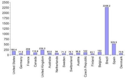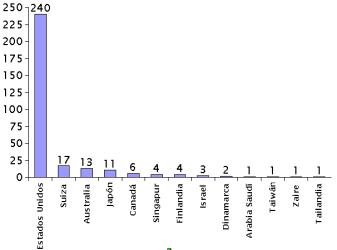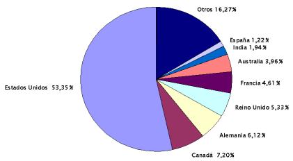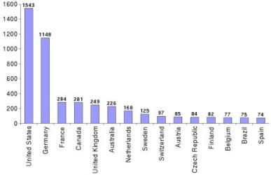 En la primera gráfica se puede ver la distribución de nacionalidades en Widi. En comparación con las otras fuentes del estudio sólo cabe resaltar la buena posición de Canadá, muy por encima de los otros resultados. España ocupa la decimoquinta posición.