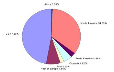 Como en los casos anteriores, vamos a agrupar los países por continentes para ver el peso de cada uno. Se puede observar una gran participación europea, muy superior a la norteamericana. Widi, al igual que las otras fuentes, también certifica que la participación de desarrolladores provenientes de los contienentes africano, asiático y sudamericano es bastante pobre.