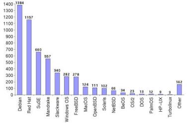 Entramos ya en la parte en la que cubrimos las preferencias de los desarrolladores. La primera pregunta con la que nos vamos a ocupar es con el sistema operativo / distribución preferido/a de los desarrolladores. Se puede ver que una mayoría prefiere las distribuciones de GNU/Linux, situándose Debian a la cabeza. Los adeptos a Windows son igual de numerosos que los que respondieron que su sistema operativo favorito era FreeBSD.