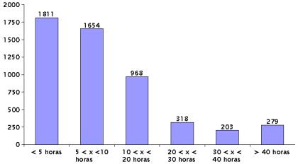 De la siguiente gráfica se desprende que más de un 60% de los desarrolladores dedican menos de 10 horas a la semana al software libre. Aquéllos que le dedican más de 20 horas representan algo menos de la sexta parte del total.