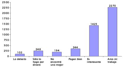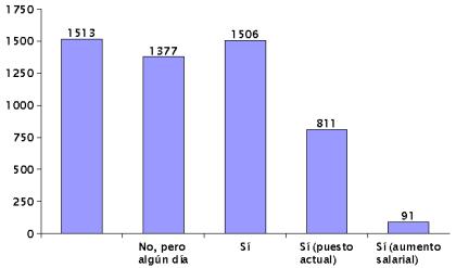 Entramos ya en el campo laboral. La primera cuestión trata con la profesión. Nótese que hemos dividido las profesiones en dos áreas diferentes: el de las tecnologías de la información y el resto. Es interesante ver que la profesión más frecuente es la de ingeniero software. Los programadores, a su vez, se sitúan por detrás de los estudiantes de carreras de relacionadas con las tecnologías de la información, pero también muy por delante del resto de profesiones.