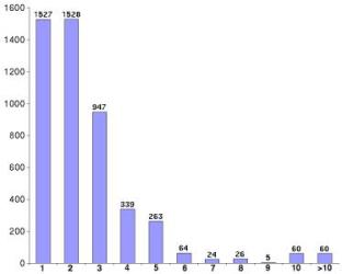 Al igual que en el párrafo anterior en el que nos ocupamos de la dedicación temporal, podemos ver que el número de proyectos en los que un desarrollador participa, sigue una distribución similar. El 60% está vinculado a uno o dos proyectos, mientras que el número de desarrolladores que participan en cuatro o más no llega a la sexta parte.