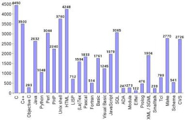 Para terminar, y de manera escueta, mostramos la gráfica de las herramientas y lenguajes que los desarrolladores dicen conocer. Una nota curiosa al respecto es que esta distribución se mantiene con mínimas diferencias también de modo nacional y por continentes, lo que supone que los desarrolladores libres suelen tener unos conocimientos similares independientemente de su emplazamiento geográfico y cultural.