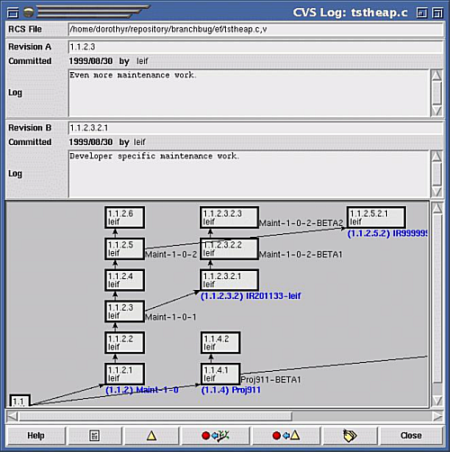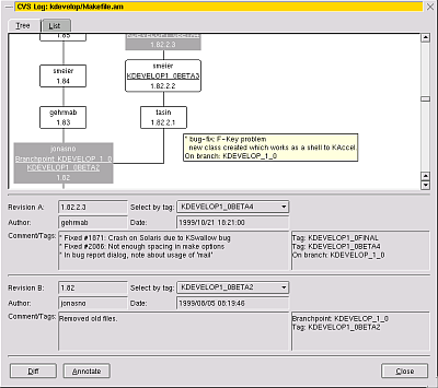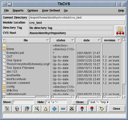 tkcvs: Interfaz gráfica para CVS escrita en Tcl/Tk muy establecida y estable, disponible en http://www.twobarleycorns.net/tkcvs.html. El pantallazo de su ventana principal,