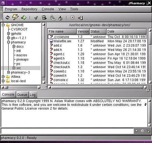 pharmacy: Una interfaz GNOME para CVS, disponible en http://pharmacy.sourceforge.net/. Se encuentra aun en un estado de desarrollo bastante temprano y no se actualiza desde hace casi un año en el momento de escribir esto. Aquí se puede ver un pantallazo del aspecto de su pantalla principal: