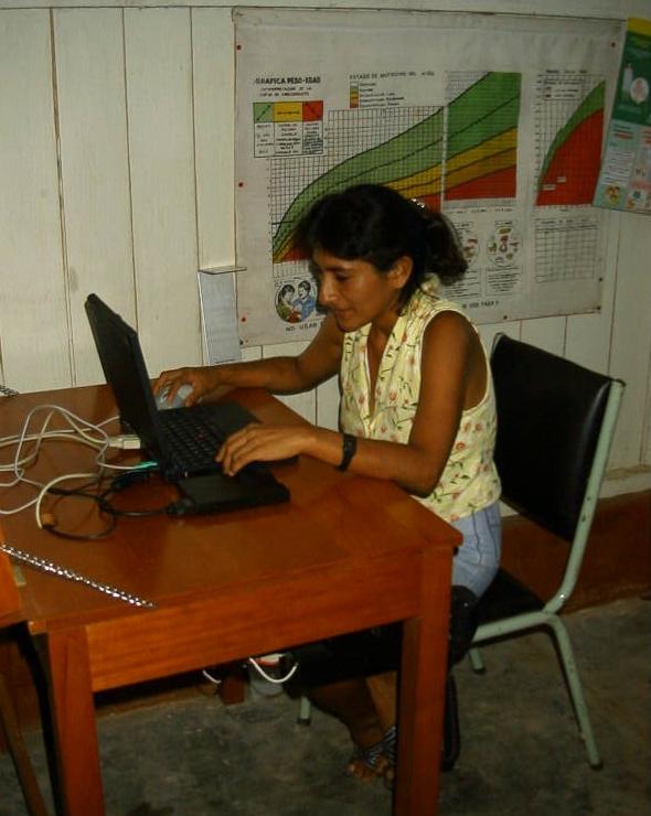 En Alto Amazonas las condiciones locales impusieron que los clientes fueran máquinas portátiles MS-Windows, lo que condicionó la solución adoptada y ocasionó no pocas dificultades, debido al carácter cerrado de la plataforma y del software auxiliar, así como por lo limitado de la arquitectura y su vulnerabilidad. La foto muestra el uso de uno de esos clientes.