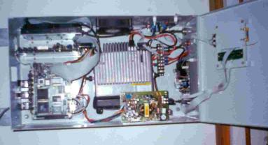 Los servidores en cambio fueron máquinas Debian GNU/Linux realizadas con componentes PC/104[12], de bajo consumo y gran robustez y fiabilidad. La foto muestra el interior de uno de estos servidores, con su radio y modem.