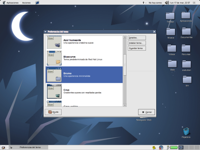 El gestor de temas nos presenta una lista con los Meta-Temas que existen en el sistema. Los meta-temas son combinaciones de temas, a la hora de escribir el artículo, combinan 3 temas, Iconos, Interface y Borde de la Ventana. Tenemos la lista de cada tema, con una previsualización del mismo, su nombre y una descripción. Seleccionandolo cambiamos los temas rapidamente, pero si ninguno de los Meta-Temas nos agrada podemos pasar a crear uno propio, seleccionando en el botón Detalles... pasaremos al dialogo de selección de detalles del tema, en la que podremos seleccionar el tema de Iconos, Interface y Borde de la Ventana de los que dispongamos.
