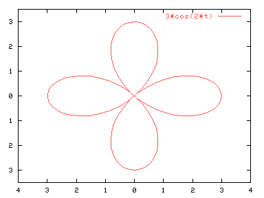 En coordenadas polares la variable t se refiere al ángulo. Se dispone de la opción "set trange [t1:t2]" para indicar el intervalo en el que queremos que se represente nuestra figura. Por defecto se hará entre 0 y 2*pi. El gráfico se representa en un área rectangular; las opciones "set xrange" y "set yrange" modificarán tanto la altura como la anchura. Por ejemplo: