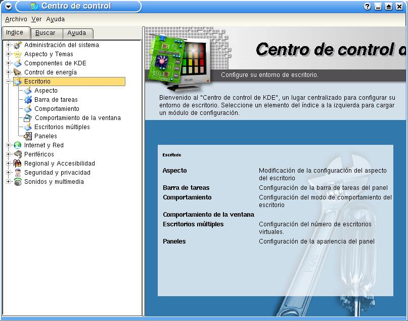 Escritorio: los módulos integrados en esta categoría configuran: el panel, la barra de tareas, el comportamiento de las ventanas, etc.