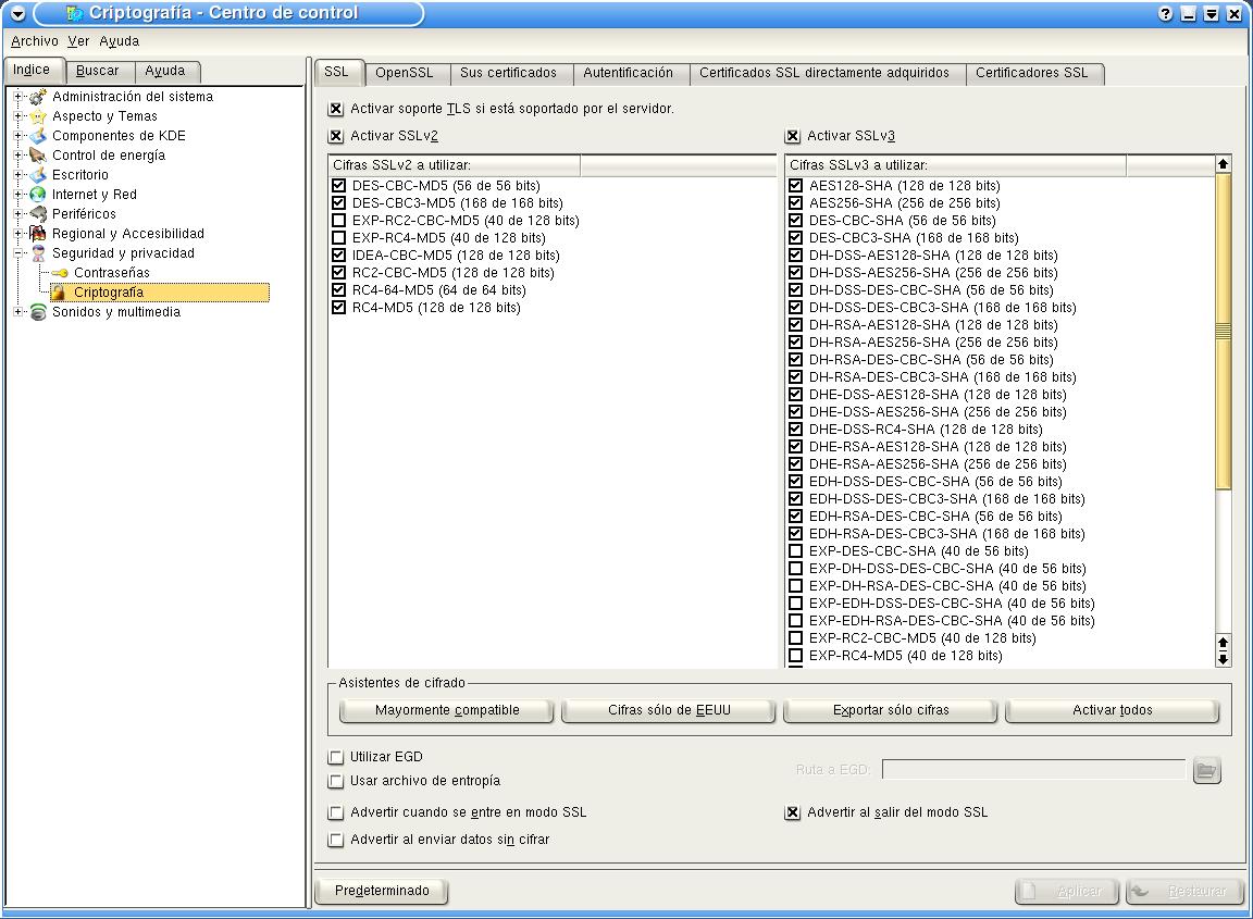Seguridad y privacidad: aqui se configuran todas las cuestiones de cifrado y certificados.