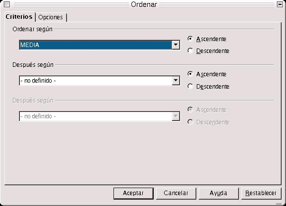 Nos vamos a la barra de menús, y dentro de Datos, nos movemos hacia Ordenar. Enseguida aparece un cuadro de diálogo, con dos fichas y un conjunto de campos. En la ficha criterios introduciremos el nombre del primer, segundo y tercer encabezados según los cuales van a ordenarse los datos, y el orden en que deseamos que aparezcan, descendente o ascendente. Podemos seleccionar el que queramos. En la ficha Opciones nos encontraremos con una serie de casillas de verificación y campos. Aquí es dode se activa la casilla de verificación Area Contiene Encabezamientos de Columnas. Esto es importante porque si no activo dicha casilla, tomará los datos, pero tomando los encabezamientos como unos datos más cualquiera.