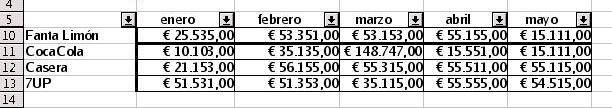 Para comenzar, vamos a hacer un autofiltro sobre la tabla de datos de Beneficios por Bebida. Primero seleccionamos el área de trabajo en Seleccionar Area, y después en la barra de menús, nos vamos a Datos, y seleccionamos Filtro-->Autofiltro. Inmediatamente aparece, por cada columna, un cuadro combinado de selección. En cada uno de dichos cuadros podemos seleccionar distrintos criterios para el filtro, y los aplicará de forma automática.