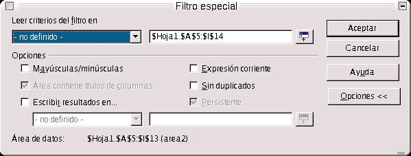 Para seleccionar como filtrado el estándar, quitamos primero el autofiltro, seleccionando el área y después yendo a Filtro-->Autofiltro. De esta forma hemos desactivado el autofiltro. Seleccionamos Filtro-->Filtro Predeterminado (o Estándar), y le ponemos el criterio de filtro que deseemos en el cuadro de diálogo, sabiendo cómo funcionan los operadores lógicos (O) y (Y). Para ver las opciones, pulsamos sobre el botón Opciones. La más importante de ellas es la que nos dice que podemos presentar el resultado del filtrado en otra zona de la hoja de cálculo. Para ello, hemos de seleccionar con el botón izquierdo presionado, la zona sobre la cual queremos que se presenten dicho resultado, y pulsamos en Aceptar.