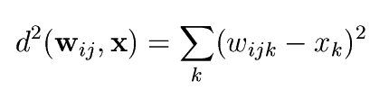Para cada neurona del mapa, calcular la distancia euclídea entre el patrón de entrada x y el vector de pesos sinápticos