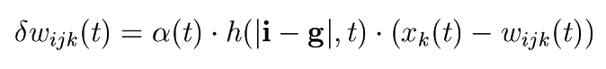 alfa(t) es un factor llamado ritmo de aprendizaje que da cuenta de la importancia que la diferencia entre el patrán y los pesos tiene en el ajuste de los mismos a lo largo del proceso de aprendizaje. Hay varias posibilidades para esta función, desde un constante hasta algún tipo de funcion monótona decreciente con el tiempo. h es una función de vecindad que nos indica en que medida se modifican los pesos de las neuronas vecinas. Con esto quiere decir que cuando la neurona ganadora modifica sus pesos, la vecindad de esta neurona lo hace también, en mayor o menor medida según sea la forma funcional de h. En general, las funciones empleadas para h tienen un máximo en |i-j|=0 y decrecen más o menos rapido a medida que esta distancia aumenta.Lo usual es fijar un numero de iteraciones antes de comenzar el aprendizaje. Si no se llegó al numero de iteraciones establecido previamente, se vuelve al paso 2. Sobre este número de iteraciones necesario, se suelen tomar criterios como el número de neuronas en el mapa.