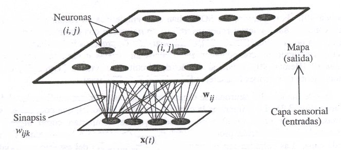 Como se puede apreciar es una red de tipo unidireccional. La red se organiza en dos capas, siendo la primera capa la formada por las neuronas de entrada. La segunda capa consiste en un array de neuronas de dos dimensiones. Como se necesitan dos índices para etiquetar cada neurona, los pesos sinapticos asociados a cada neurona tendran tres índices (i,j,k) donde (i,j) indican la posición de la neurona en la capa y k, la componente o conexión con cierta neurona de entrada.